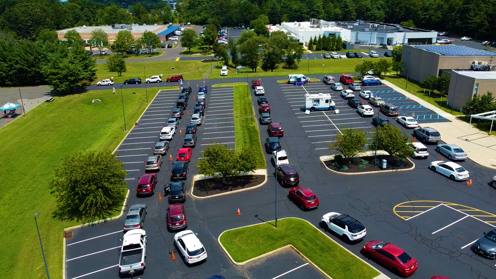 Cars outside HOPE United Methodist Church during food pantry distribution. The facility serves more than 2,000 people each month.