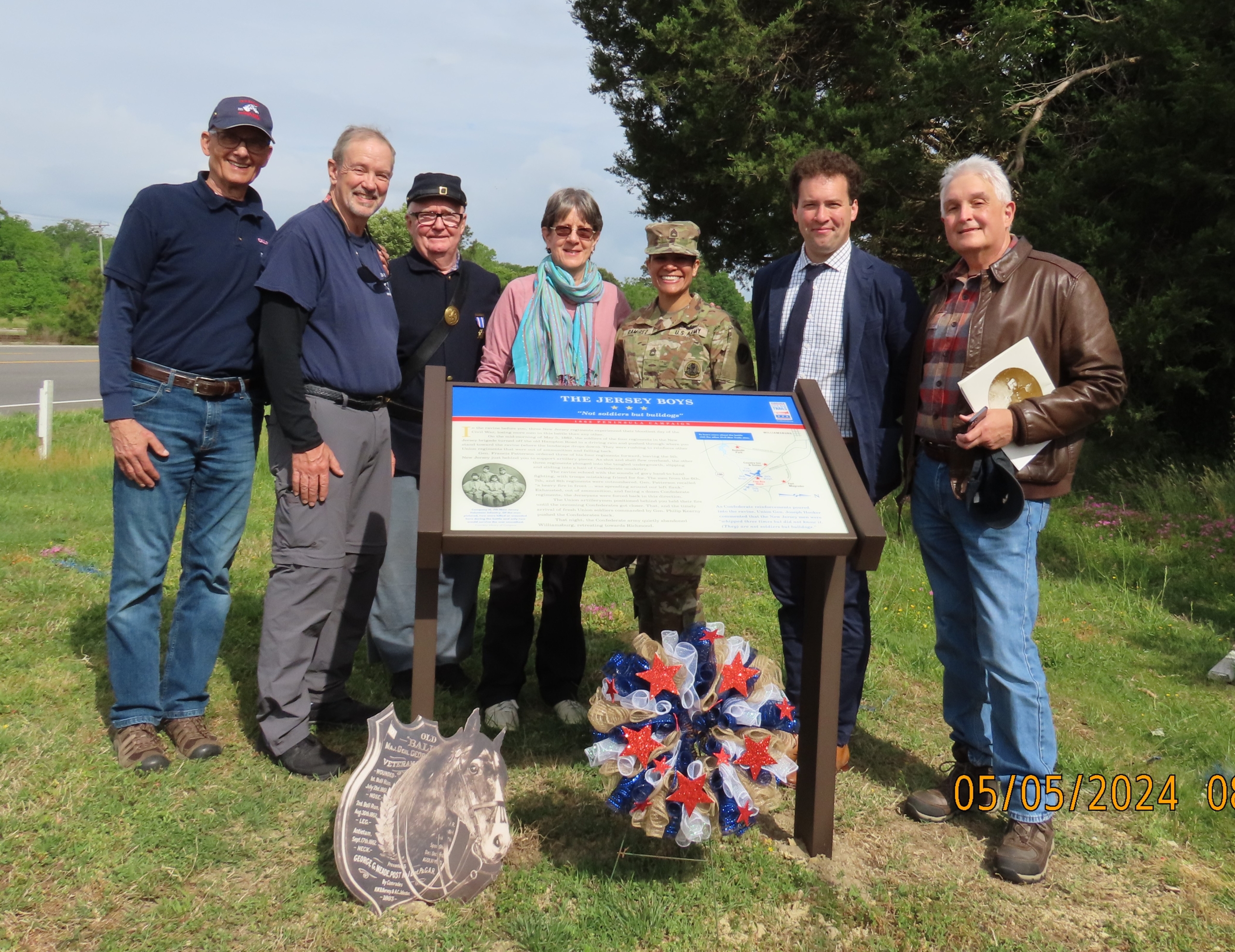 Gathered around the “The Jersey Boys” historical marker to honor the Union soldiers of the 5th, 6th, 7th and 8th NJ regiments in the Civil War’s Battle of Williamsburg are Old Baldy Civil War Round Table members Frank Barletta (left to right), Tom Scurria, Walt Lafty, Lynn Cavill, SFC Ivelis Ramirez Andujar of the Color Guard, Drew Gruber of Civil War Trails and Jerry Poslusny.