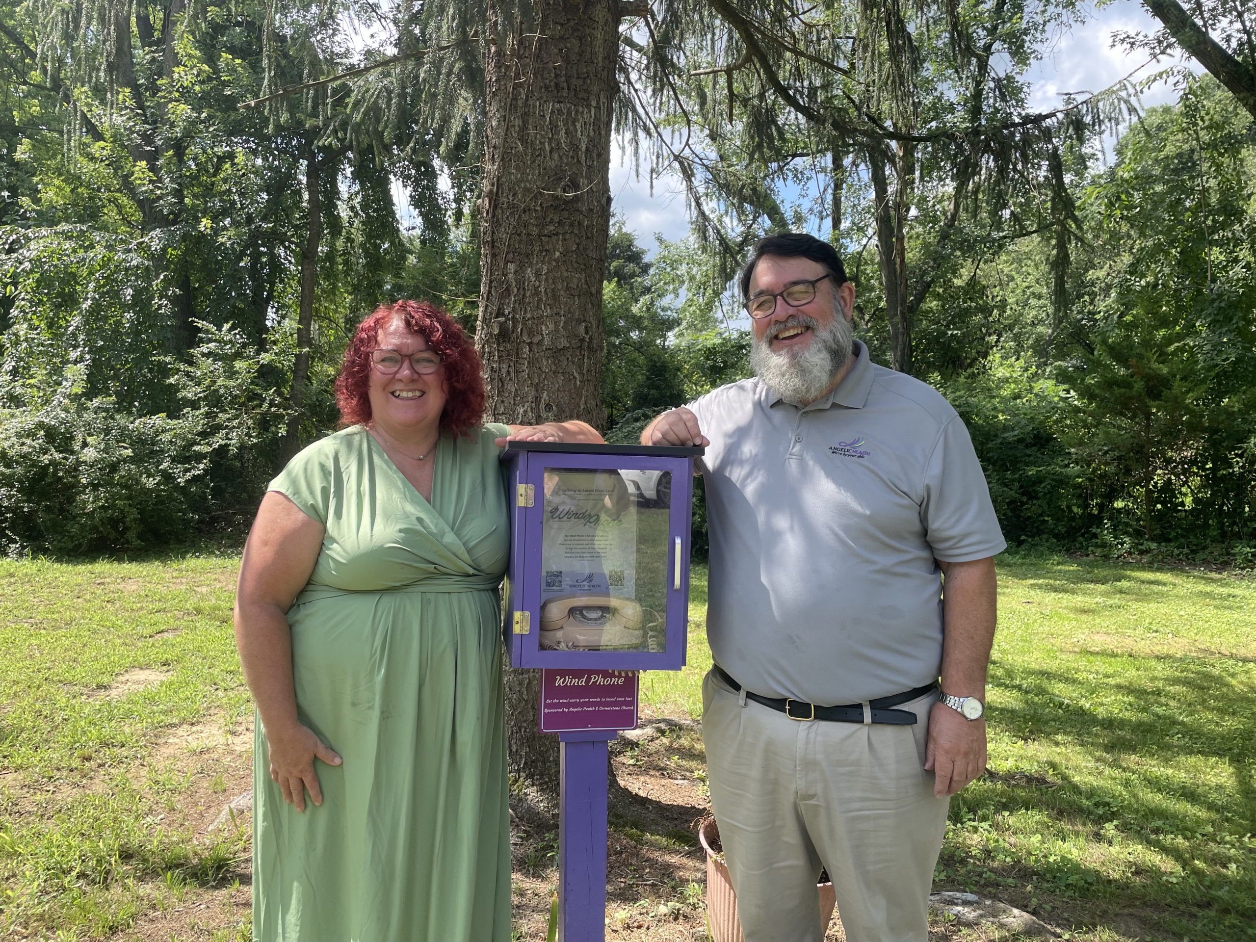 “Support groups don’t work for everybody,” says Tracy Fooks, administrator at Angelic Health Hospice, who adds that people grieve in different ways. She and Ken Jackson, bereavement coordinator and pastor at Cornerstone Church, were at the dedication of a wind phone on July 16.